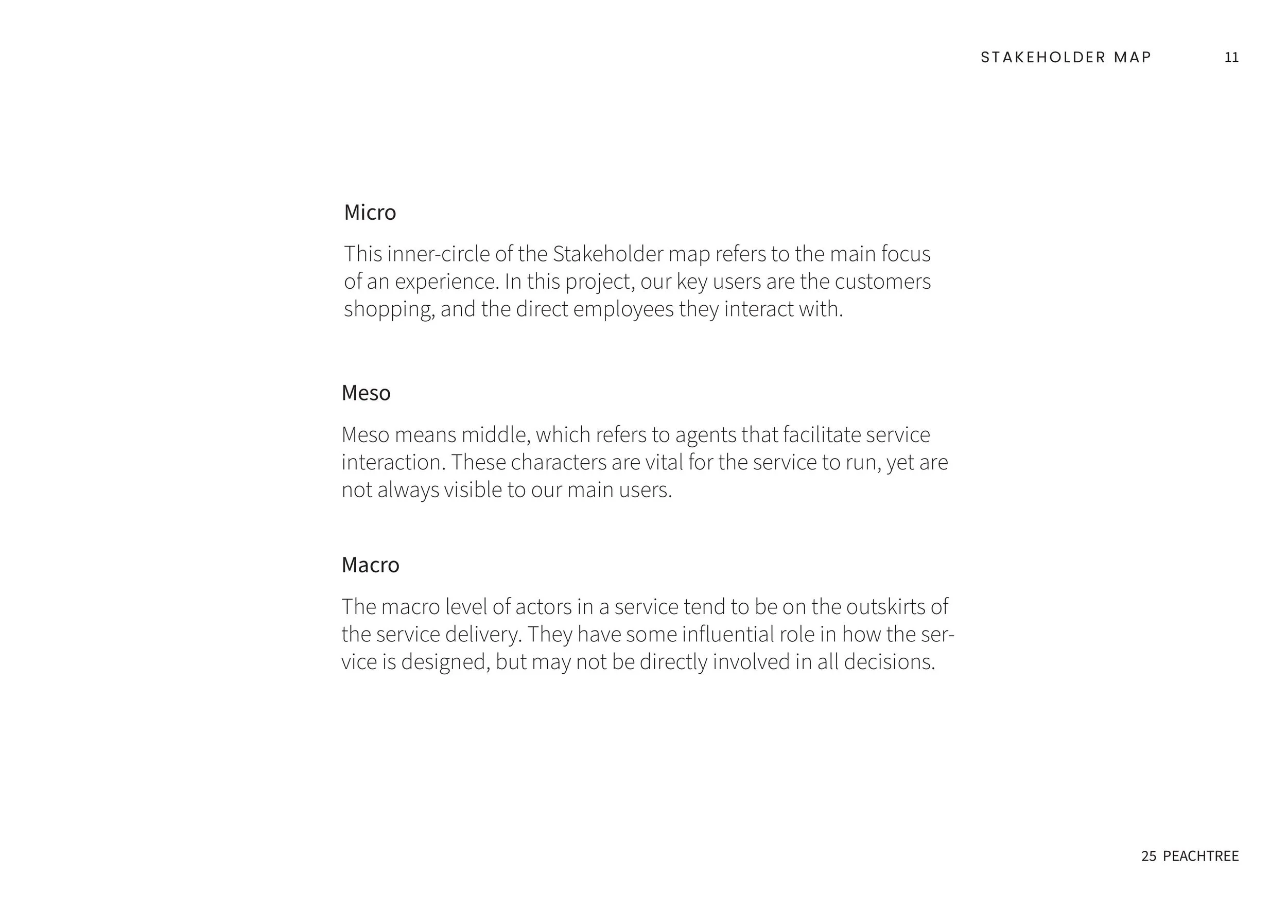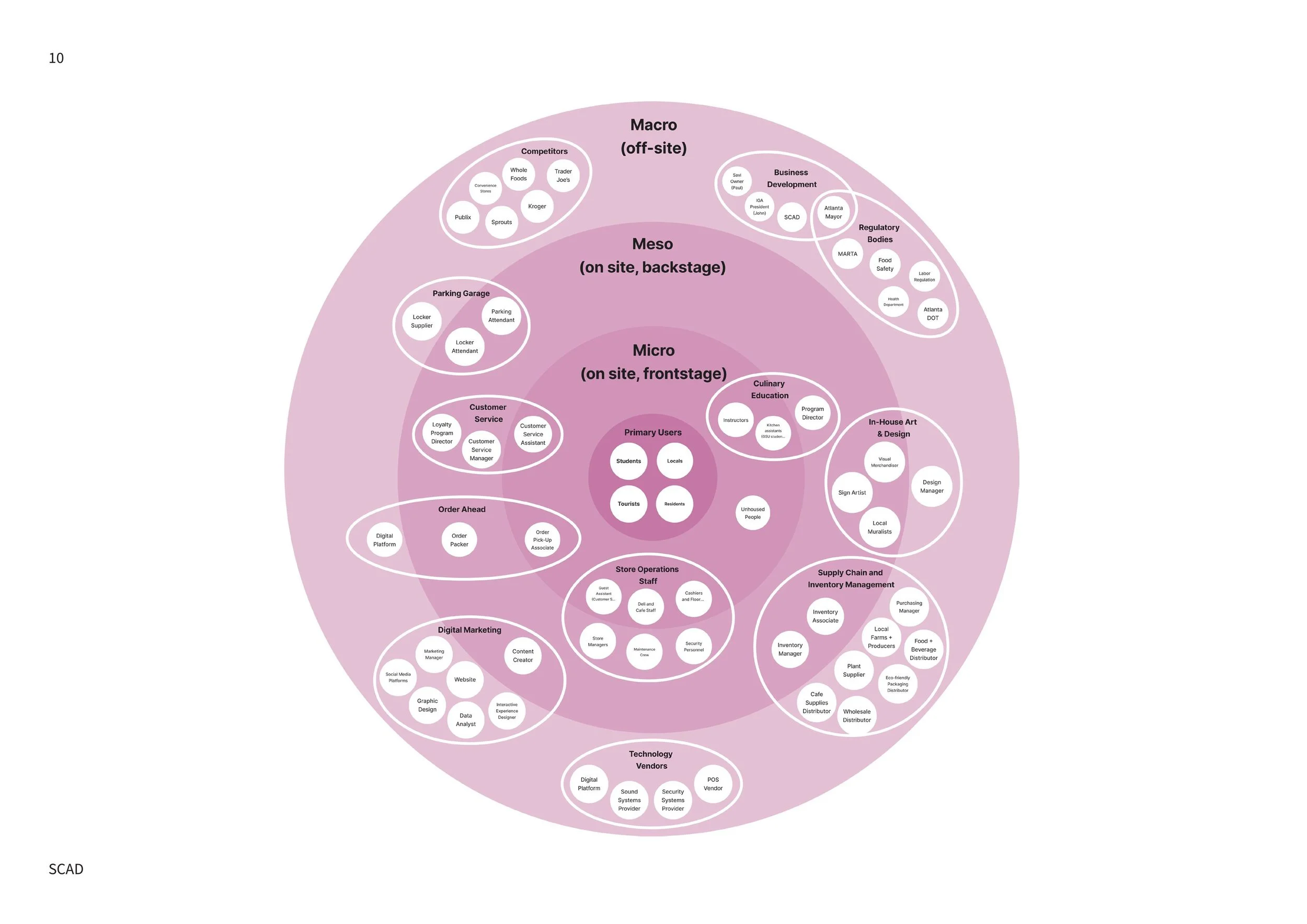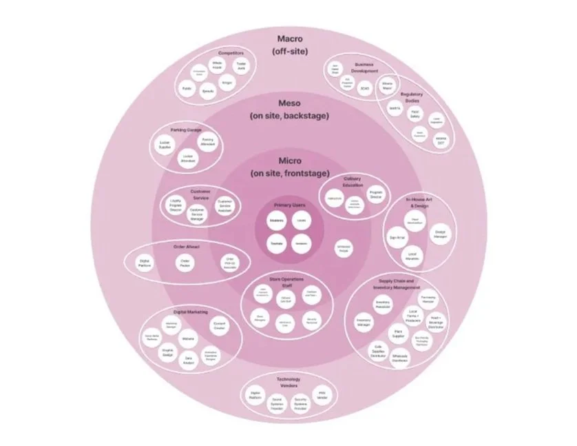 For this project, we labeled the customer and employees they directly interact with as our key users. From there, we gradually sorted the behind-the-scenes influences, all the way to the macro-level, containing groups such as regulatory bodies and direct competitors.