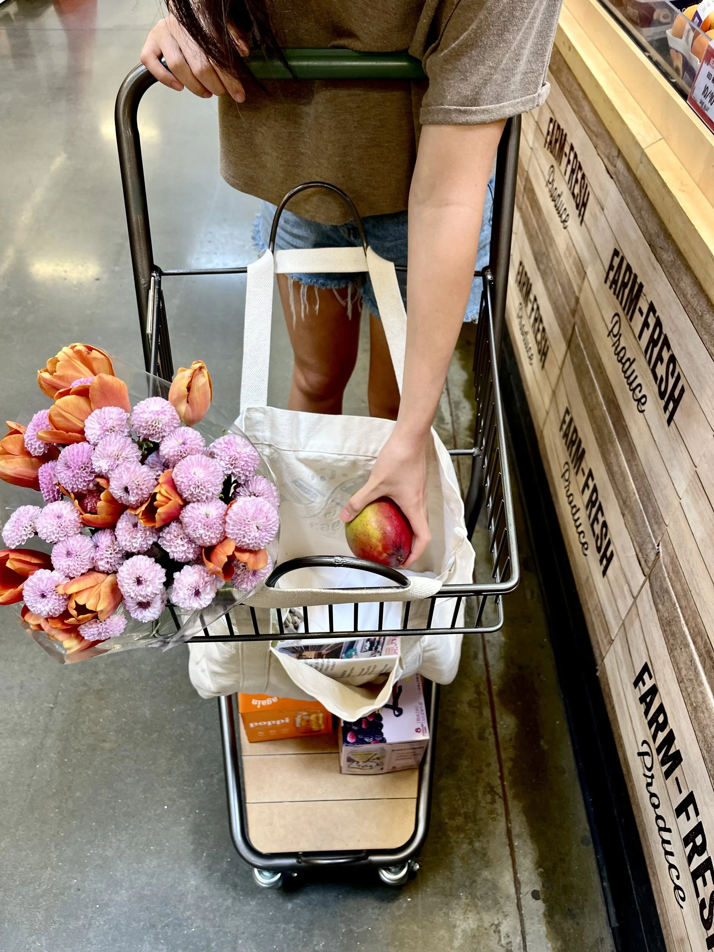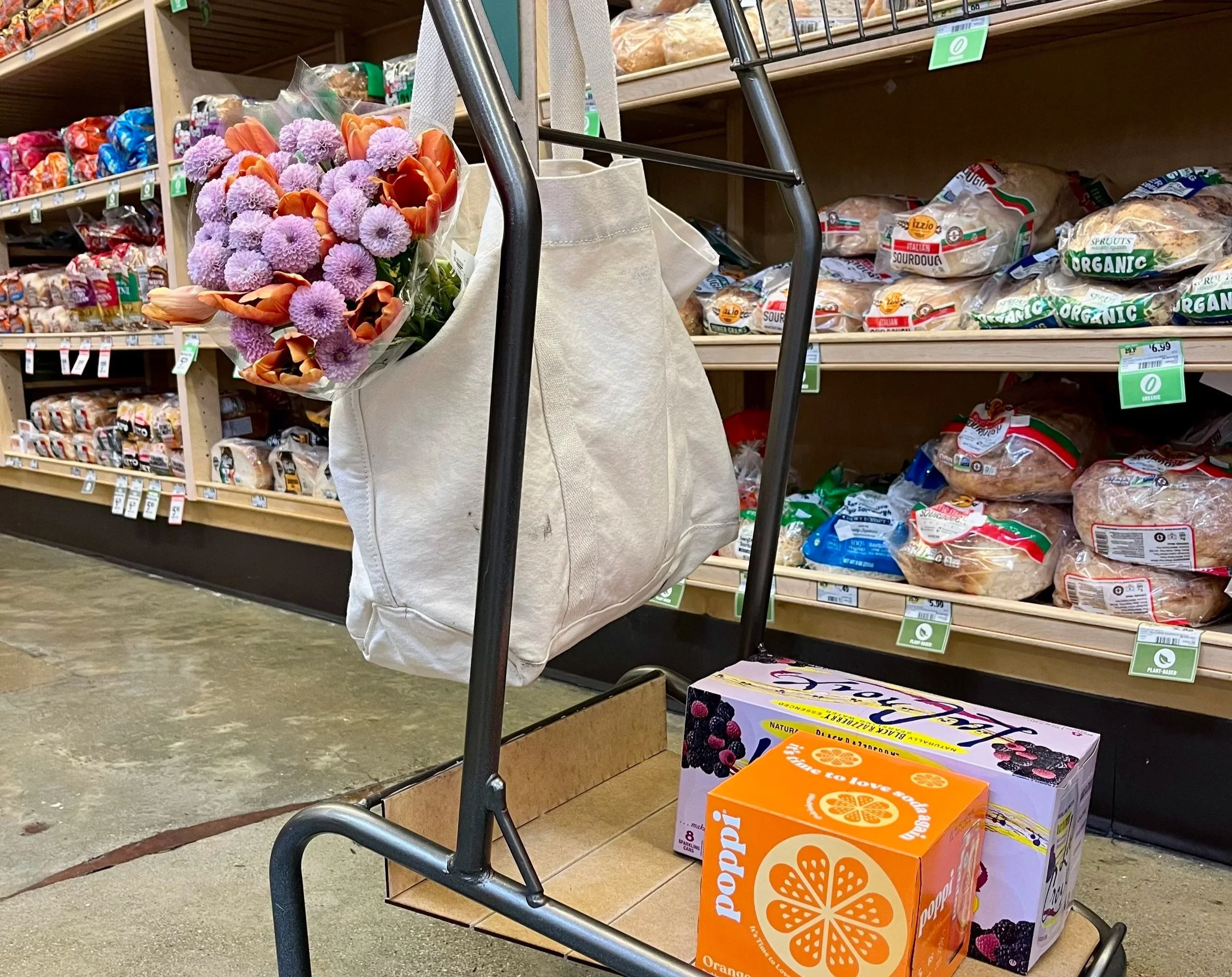 The multi-use frame at the top of the cart features an open wire structure with two loops on either end. It holds a custom shopping basket, while the loops allow reusable tote bags to rest open for an intuitive shopping experience, encouraging customers to buy only what they can carry. The tote bags can also hang from the loops when closed, accommodating multiple bags during a single grocery run.